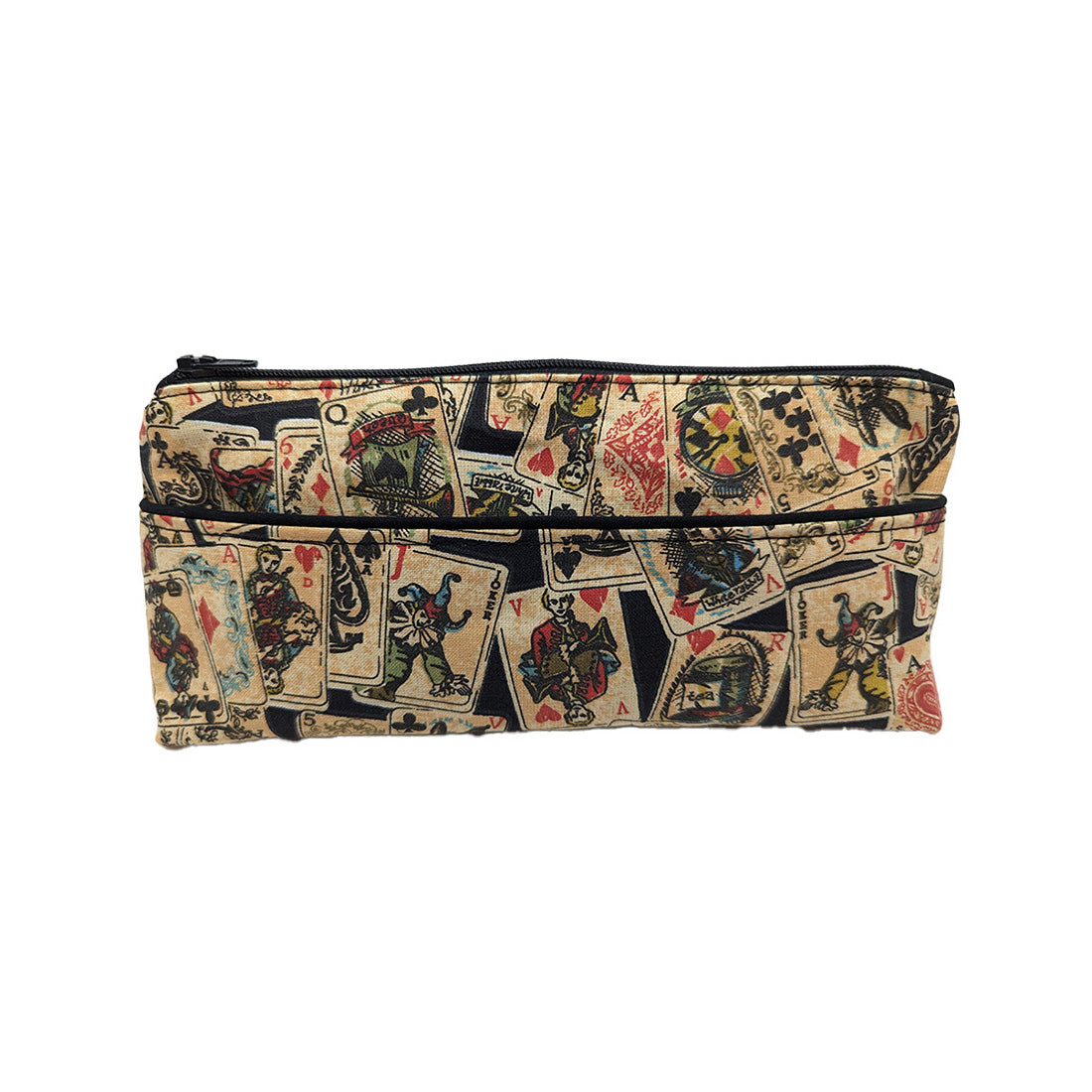 Elle est conçue dans un très beau tissu en coton noir décoré de cartes à jouer. La doublure est noire et la fermeture éclair également.