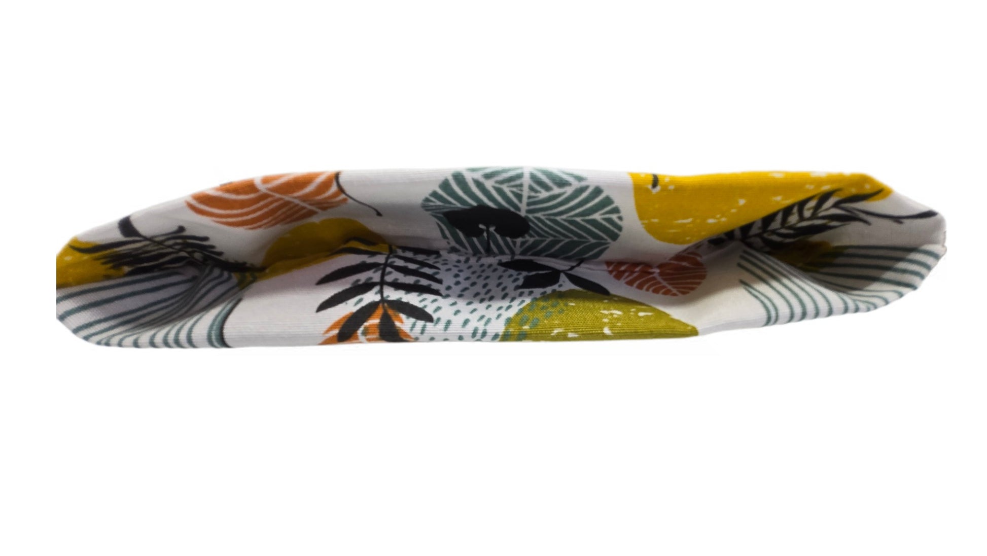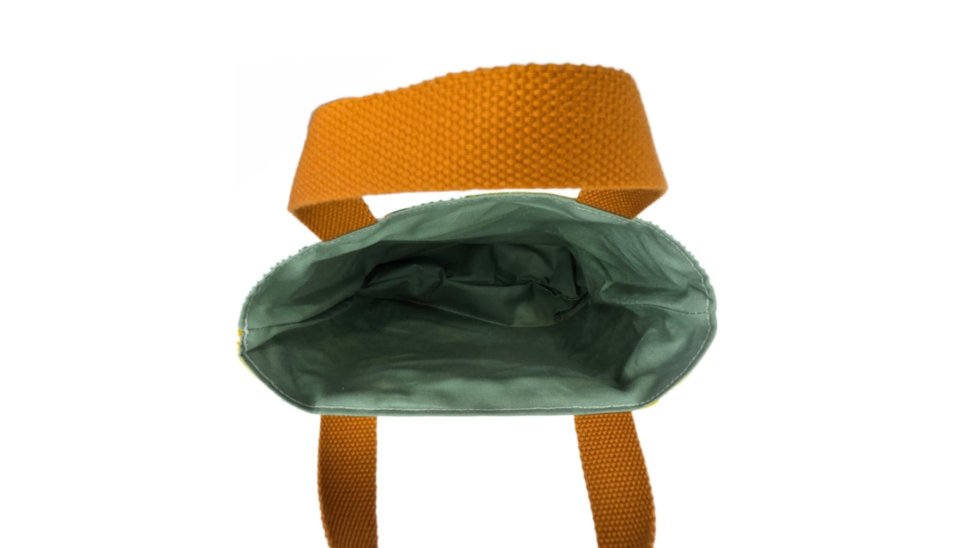 Ce mignon petit sac est conçu dans une jolie toile de coton blanche décorée de feuilles multicolores. La doublure est kaki et les anses sont brunes.