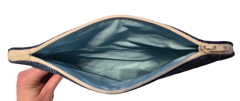 Cette pochette en jeans avec une inscription "Be Happy" et quelques fleurs brodées sur le devant a une doublure bleue.