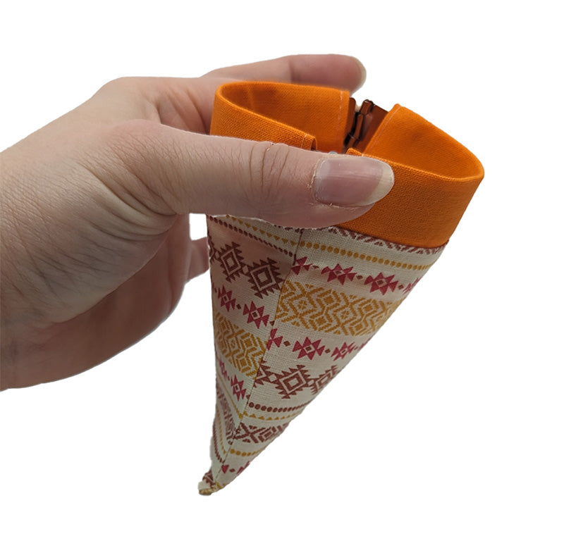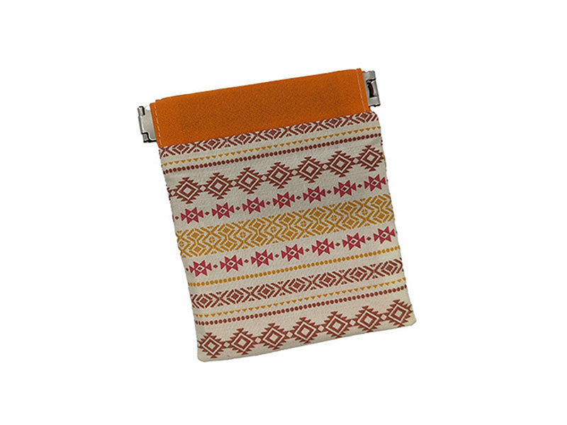 Il est conçu dans un très beau tissu à motifs aztèques et sa doublure est orange.
