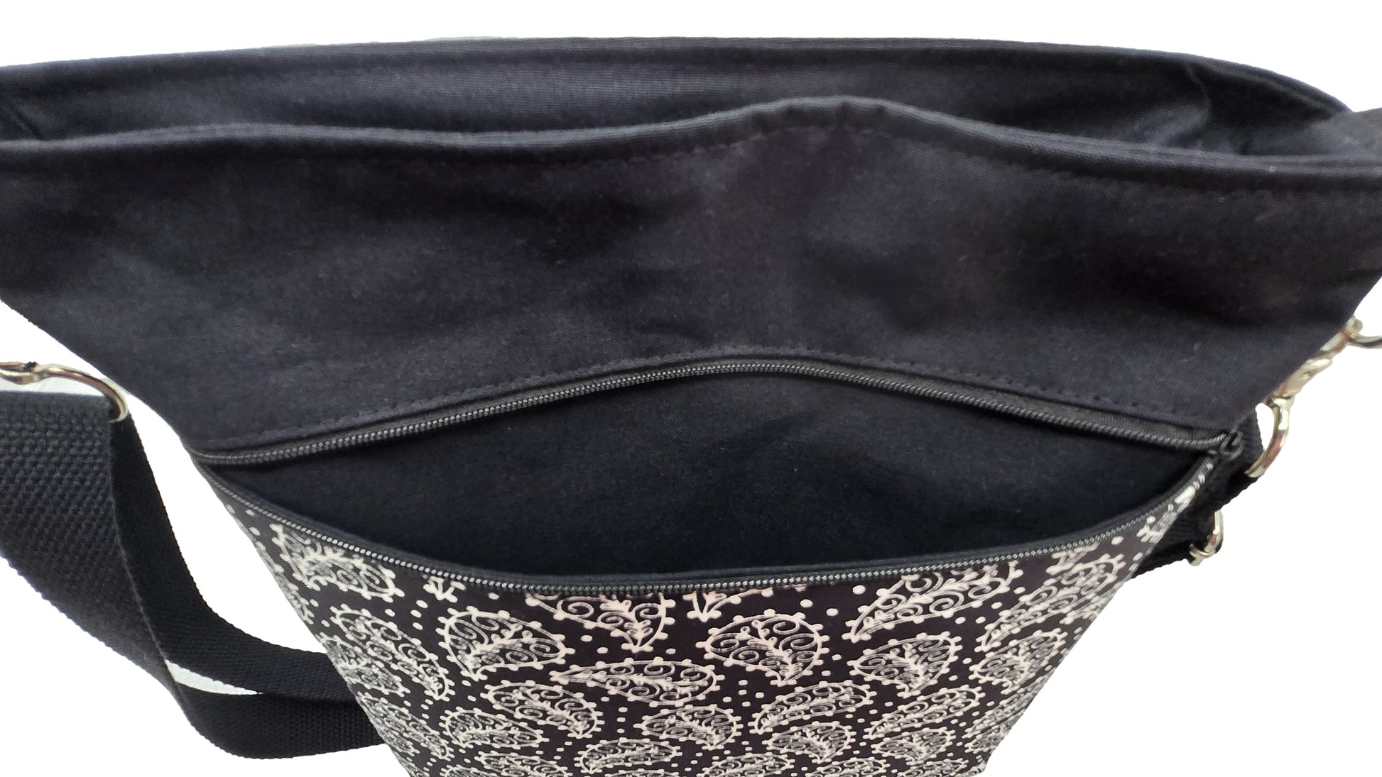 Sac à main est en coton noir avec une poche en coton noir et blanc sur le devant.