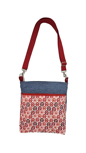 Sac à bandoulière artisanal jeans et plumes rouges