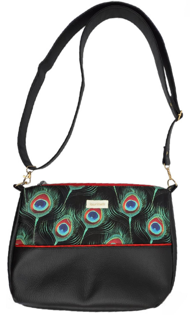 Sac à main en simili cuir noir et simili cuir noir décoré de plumes de paons à l'extérieur et popeline de coton turquoise à l'intérieur. La sangle est en simili cuir noir.