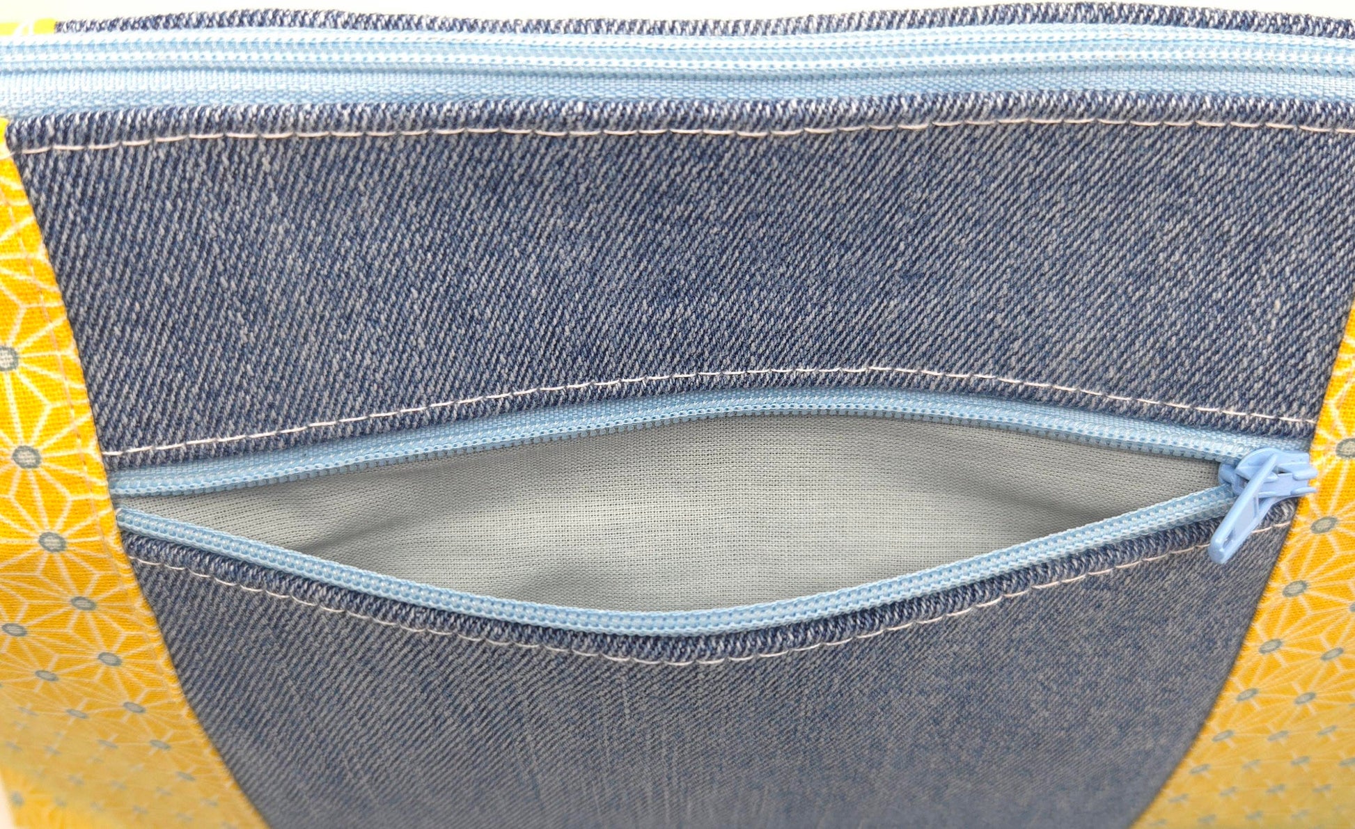 Sac à main avec une partie centrale en denim bleu et les côtés en coton décoré de motifs jaunes et bleus. La sangle et la doublure sont bleues.