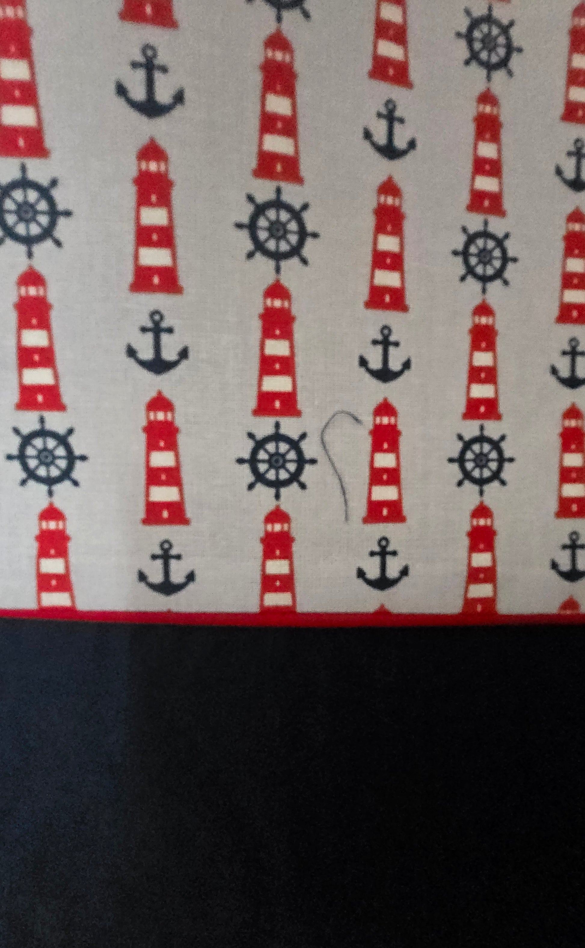 Le bas de la partie extérieure est en coton bleu marine et le haut est en coton gris clair décoré de motifs marins. La doublure et les anses sont bleues marines.