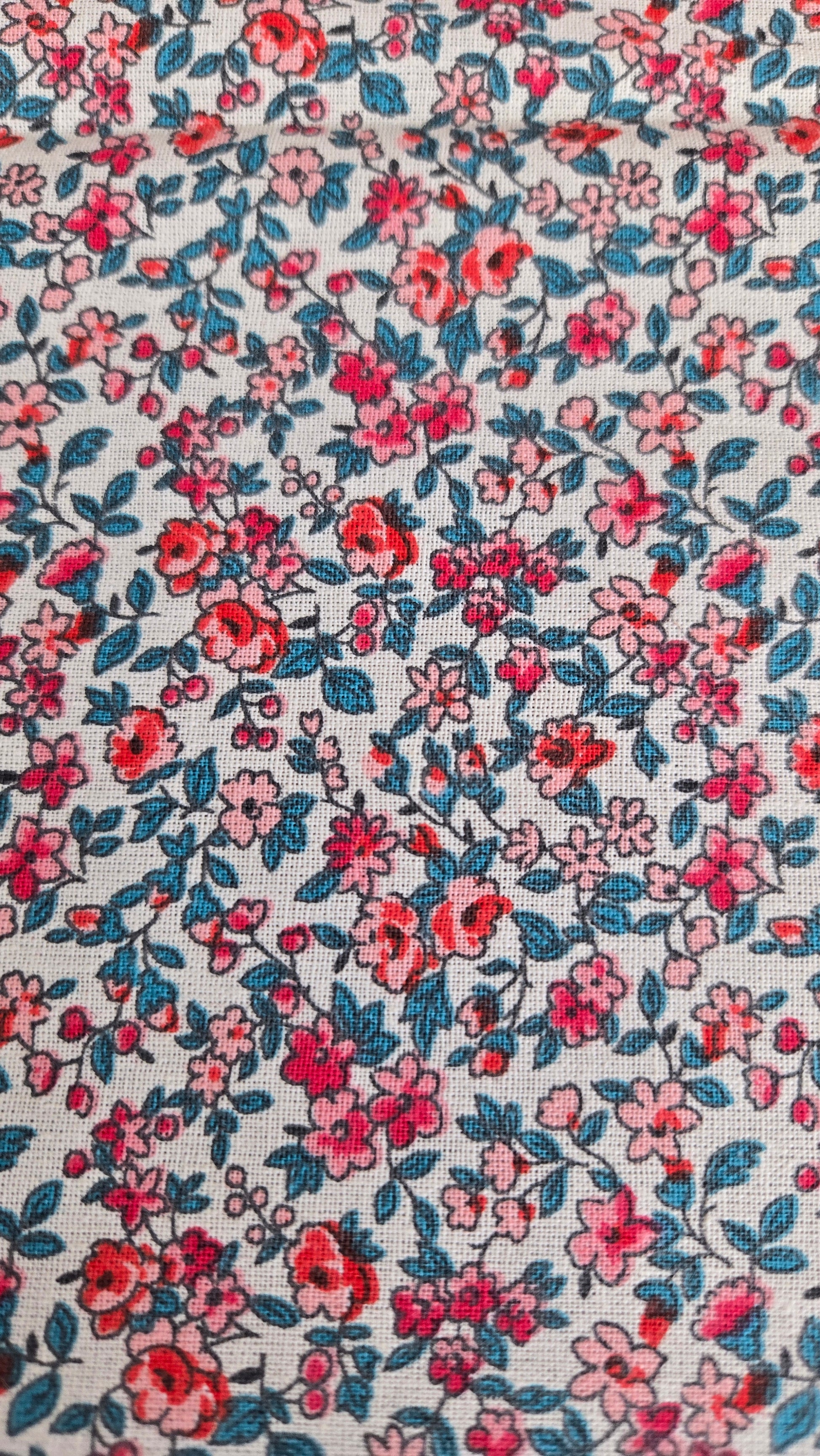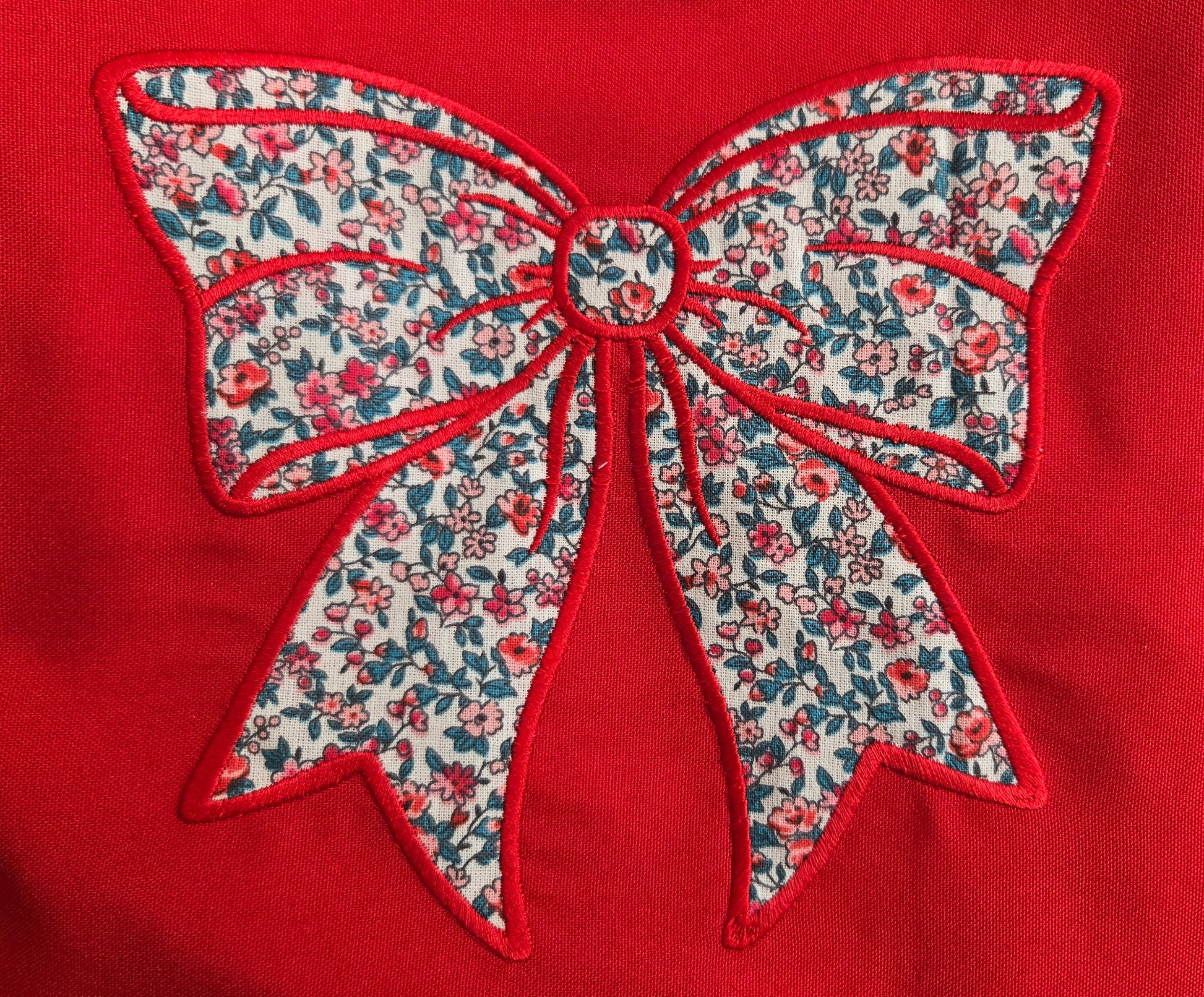 La partie extérieure est en tissu burlington (100% polyester) rouge avec un appliqué en coton fleuri en forme de gros nœud. La doublure est en coton fleuri et les anses sont en polyester vert.