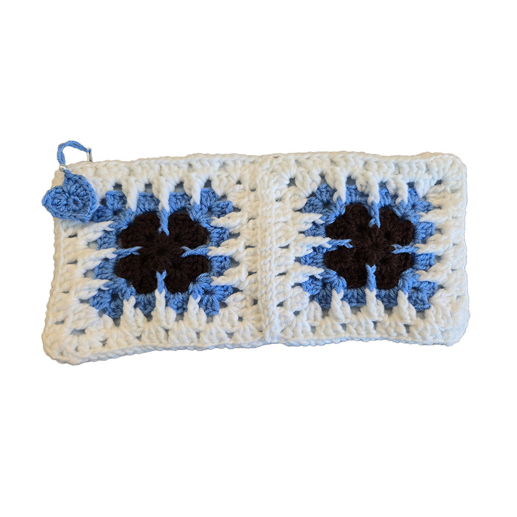 Cette petite trousse au crochet blanche, bleue et brune est équipée d'une fermeture éclair et d'une doublure en coton bleu.