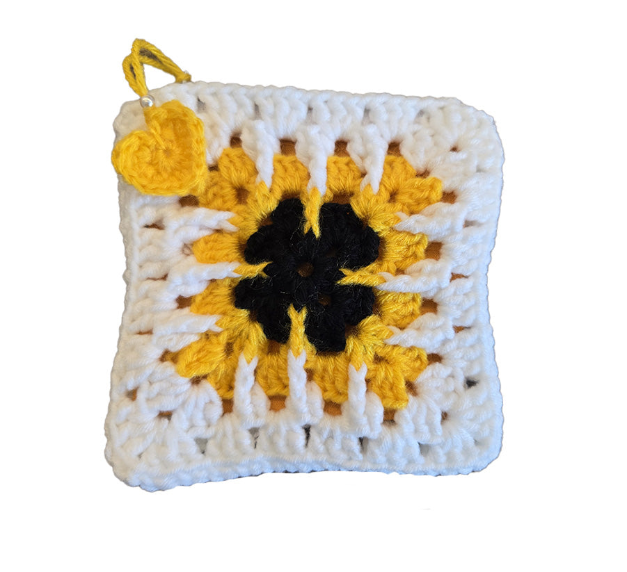 Cette petite trousse au crochet blanche, jaune et noire est équipée d'une fermeture éclair et d'une doublure en coton jaune.