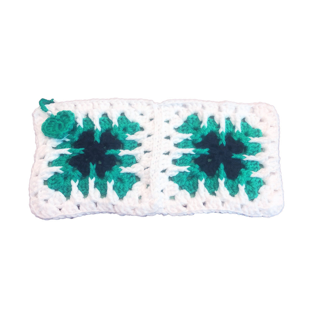 Cette petite trousse au crochet blanche, verte et noire est équipée d'une fermeture éclair et d'une doublure en coton vert.