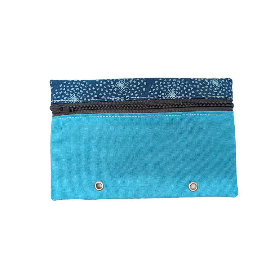 Cette petite trousse est équipée d'une fermeture éclair et de deux rivets qui permettent de la glisser dans les anneaux d'un classeur.